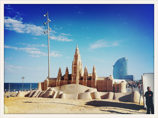 Rannalla rakennetaan usein taidokkaita hiekkalinnoja, mutta kuvan linna voittaa kyllä mahtavuudellaan kaikki aiemmin näkemäni. Se olikin pykätty pienimuotoista oopperamusiikin ilmaisleffafestaria varten. Taustalla häämöttää uudehko purjeenmuotoinen Hotel W.